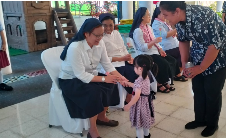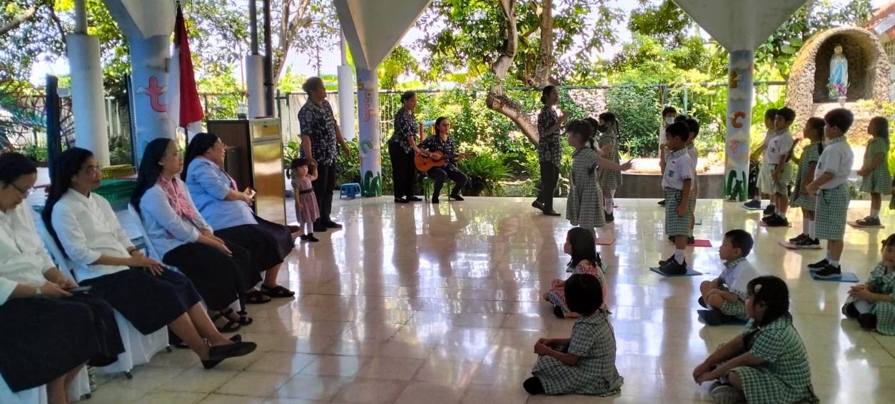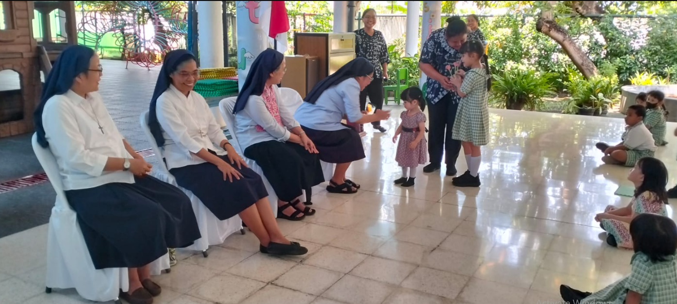 Kedatangan para suster disambut dengan penuh sukacita dan antusiasme. Acara penyambutan diawali dengan penampilan nyanyian ceria dari anak-anak TK yang membawakan lagu-lagu penuh kegembiraan, mencerminkan kepolosan dan semangat belajar mereka. Suasana semakin meriah dengan penampilan koor dari siswa SD yang membawakan lagu dengan harmonisasi indah. Tidak kalah memukau, siswa SMP turut mempersembahkan koor dengan aransemen yang lebih matang, menunjukkan perkembangan musikalitas dan kedisiplinan mereka.