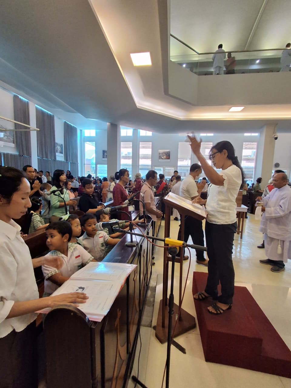 Dengan penuh semangat dan sukacita, anak-anak TK kelas B1 dan B2 mempersembahkan dengan antusias lantunan pujian yang indah dan penuh makna. Setiap nada yang dinyanyikan menjadi ungkapan syukur serta doa yang mengalun memadahkan kemuliaan Allah. Kehadiran mereka membawa suasana misa menjadi lebih khidmat dan penuh kedamaian.